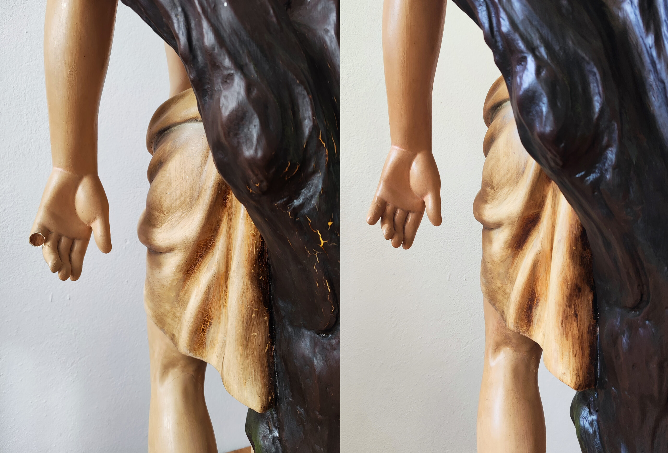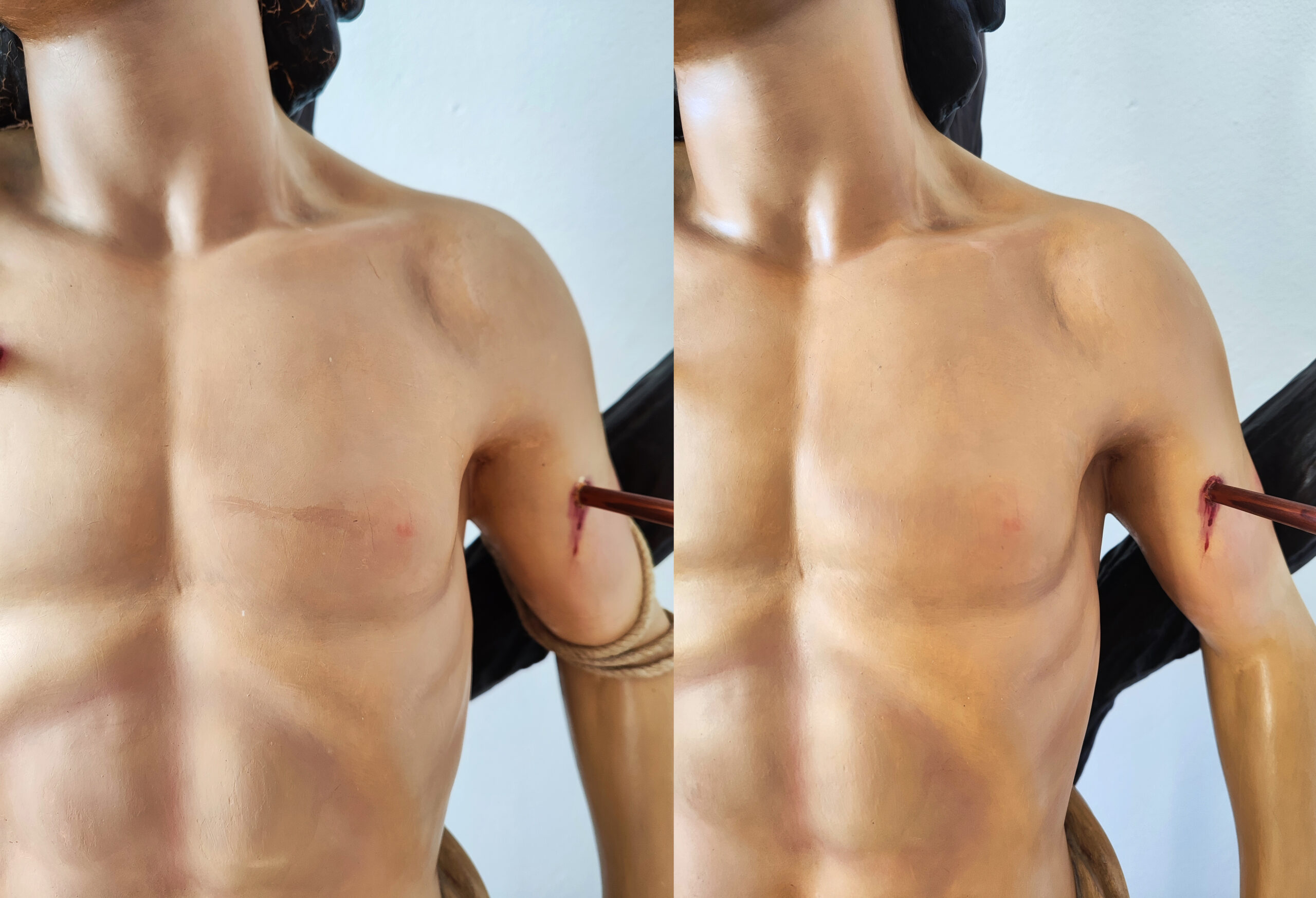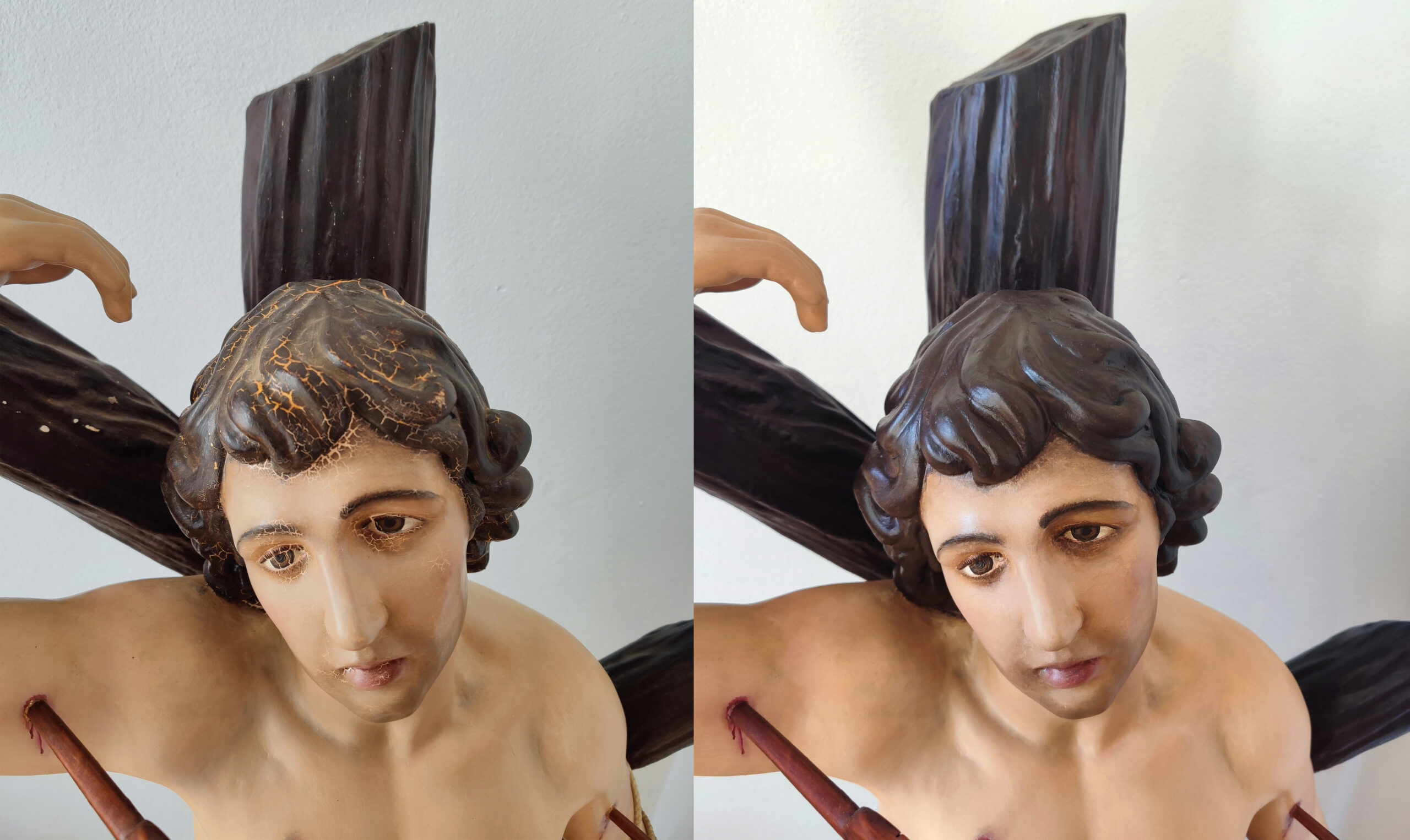 En primer lugar, se realizaron trabajos de fijación en aquellas zonas donde la policromía presentaba riesgo de desprendimiento.