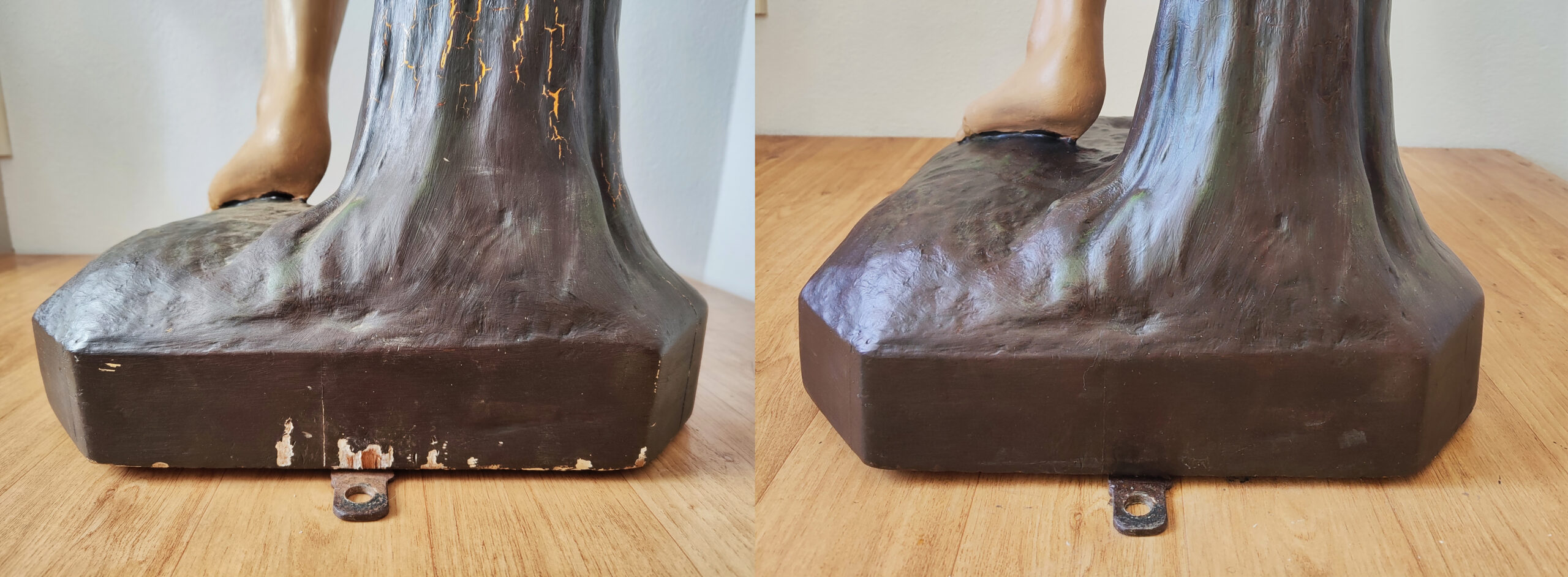 Se realizaron catas de color con pintura al agua hasta dar con una tonalidad que se asemejara lo más posible a las carnaduras, así como el tono dorado de los ropajes. Una vez seca la reintegración pictórica, se barnizó la imagen.